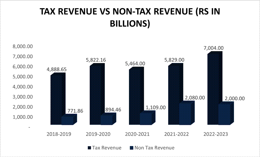 Pakistan economy’s revenue comprises Tax Revenue and Non-Tax Revenue. For the fiscal year 2022-2023, the targeted revenue is Rs 9,502 billion. Among this, Rs 7,004 billion is the targeted FBR tax revenue, 32.43% higher than the previous year, while Rs 2,000 billion is expected to come from non-tax revenue. Out of this Rs 9,502 billion, Rs 4,100 billion (43.1%) is transferable to the provincial government leaving away only Rs 5,402 billion to the federal government.