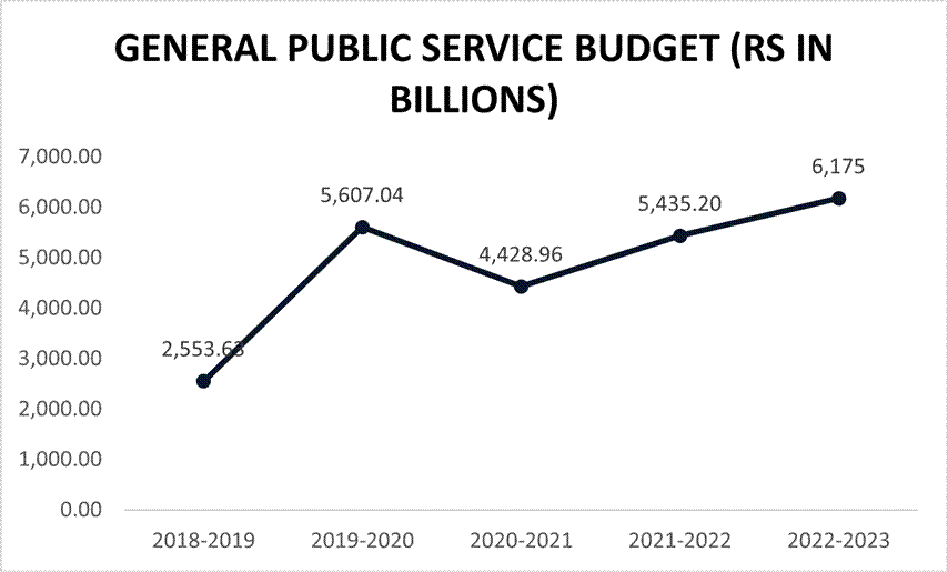 General Public Services accumulates for 71% of the total current expenditure. For the year 2022-23, the finance minister announced a budget of Rs 6,175 billion for general public services compared to Rs 5,435.2 billion for the fiscal year 2021-22.