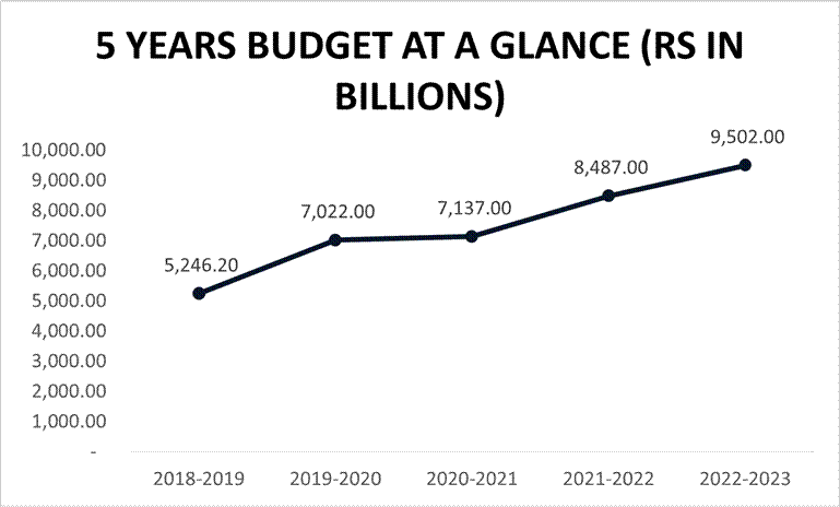 For the fiscal year 2022-2023, the total expenditure is Rs 9,502 billion, divided into current expenditure and development-oriented expenditure.